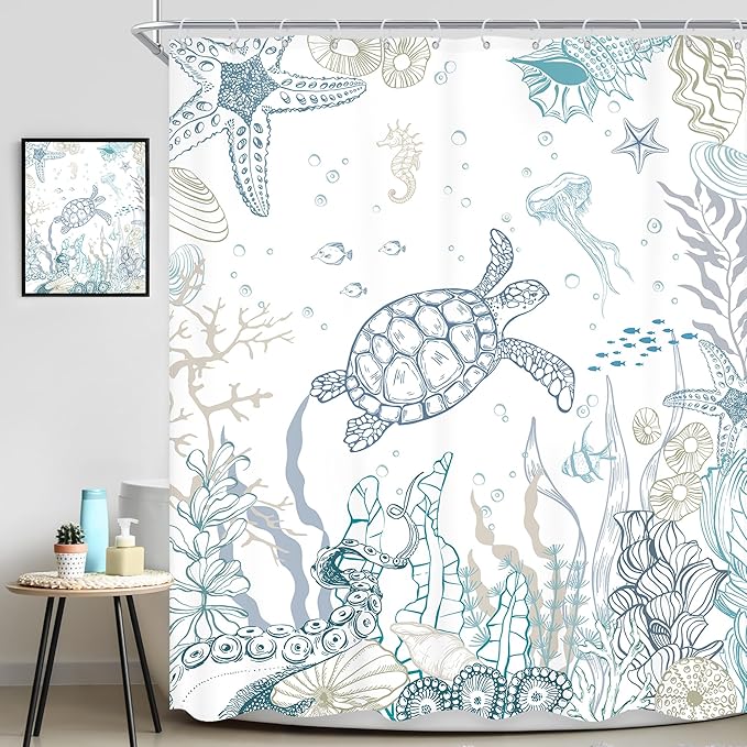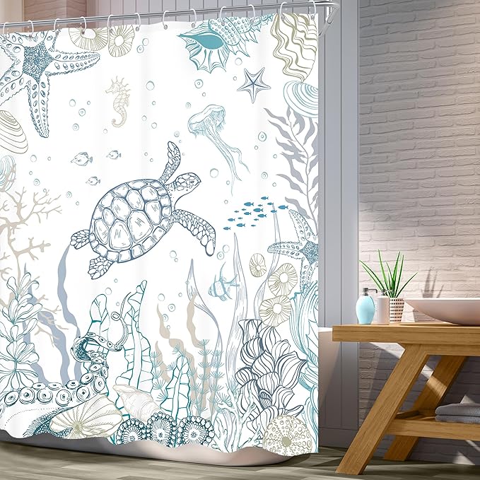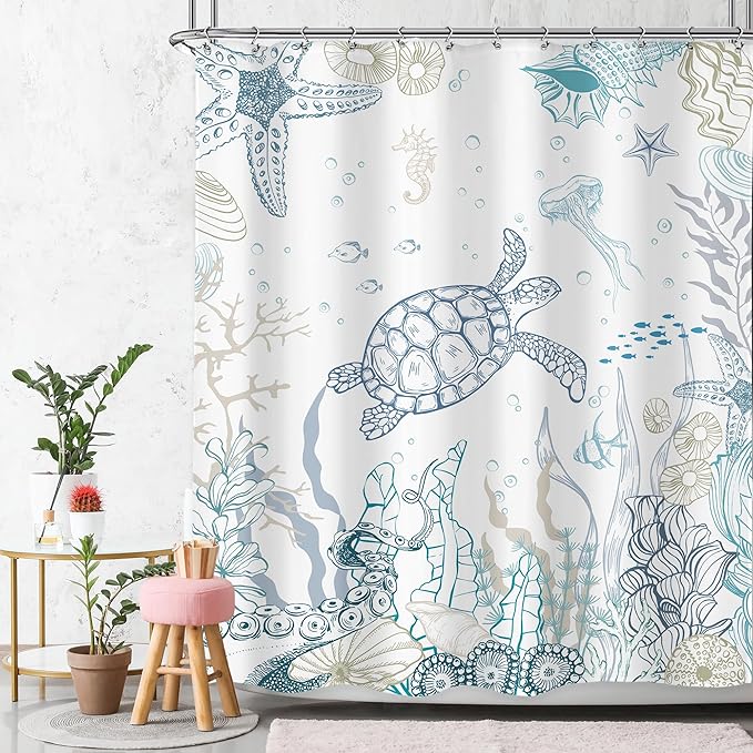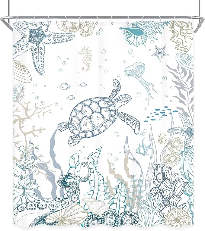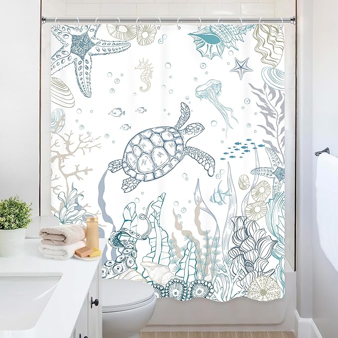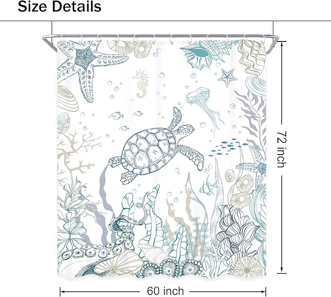 Nautical Coastal Sea Turtle Shower Curtain Ocean Beach Starfish Seashell Coral Underwater Animal Octopus Sealife Summer 60Wx72L Inch Bathroom Set Bath Curtain Bathtub Accessories Home Decor