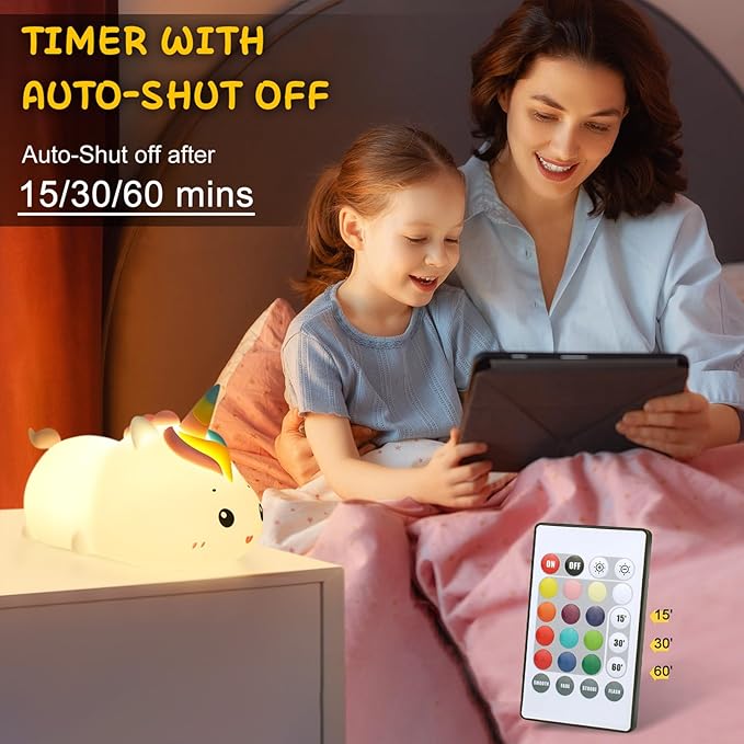 • 🦄 【Adjustable Brightness & Convenient Timer】 Rather than the generic 3-level, you can customize the 6-level illumination to suit your needs with our unicorn night lamp adjustable brightness feature. Whether it's a soft, subtle glow for bedtime stories or a brighter light for nighttime tasks, our night light adapts effortlessly. Plus, the convenient 15/30/60mins timer function of the night light lamp offers you 3 set choices, ensuring hassle-free operation with one key setting on remote controller, automatically shutting off after a set period for added convenience. These two designs are both upgraded specifically for the use of a baby night light or nursery night light.