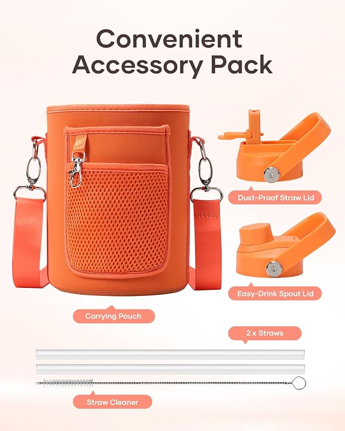 • Accessories & Warranty: With every purchase, you'll get a set of practical accessories and a lifetime warranty. The pack includes 1 x carrying pouch, 2 x lids, 2 x straws, and 1 x straw cleaner. This bottle is ideal for camping, hiking, cycling, running, gym sessions, or outdoor work, ensuring you stay hydrated wherever you go.