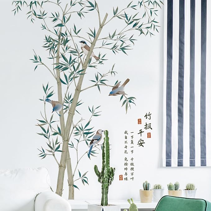 Large Bamboo Wall Stickers, Removable DIY Green Plants Flying Birds Wall Murals Peel and Stick 3D Wall Art Stickers Home Decor for Gilrs Bedroom Nursery Rooms Living Room