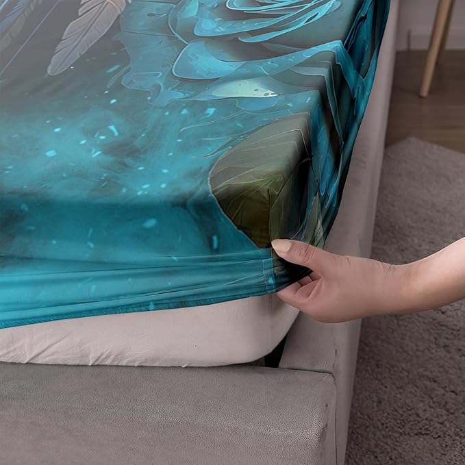 AILONEN Wolf Fitted Sheet Set Twin XL Size Dream Catcher Bed Sheet Set, Blue Rose Smoke Wolf Sheet Set for Boys Girls,Animal Wolf Fitted Sheet with 2 Pillowcases,3 Pieces
