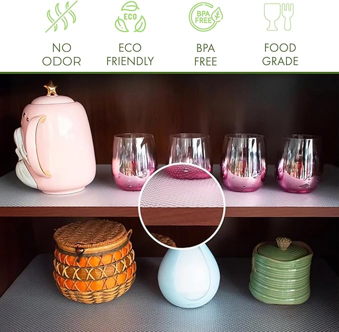 • MADE IN TURKEY: Our shelf liner was manufactured in our factory in Turkey. It is made out of high quality food grade EVA material. It is BPA free, so it is safe to be used in contact with fruits and vegetables directly. It is water proof, dust proof, and oil proof. It protects your shelves, cabinets, and drawers from scratching.