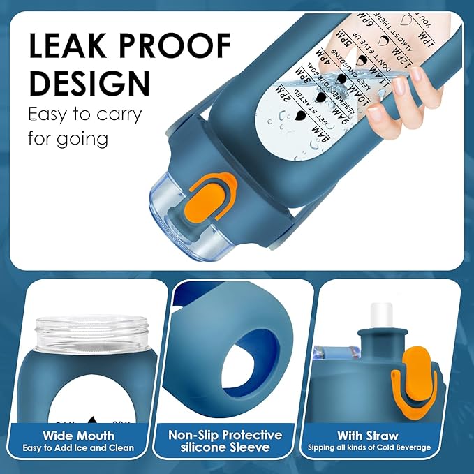 • PORTABLE WATER BOTTLE WITH TIME MARKER - This large sports water bottle comes with a creative design that includes capacity scale and time markers. It allows you to easily monitor your daily water intake and stay hydrated throughout the day. The heavy duty glass bottle with protective silicone case makes it easy to carry and attach to a bike or backpack, making it perfect for gym workouts, school, and other activities.