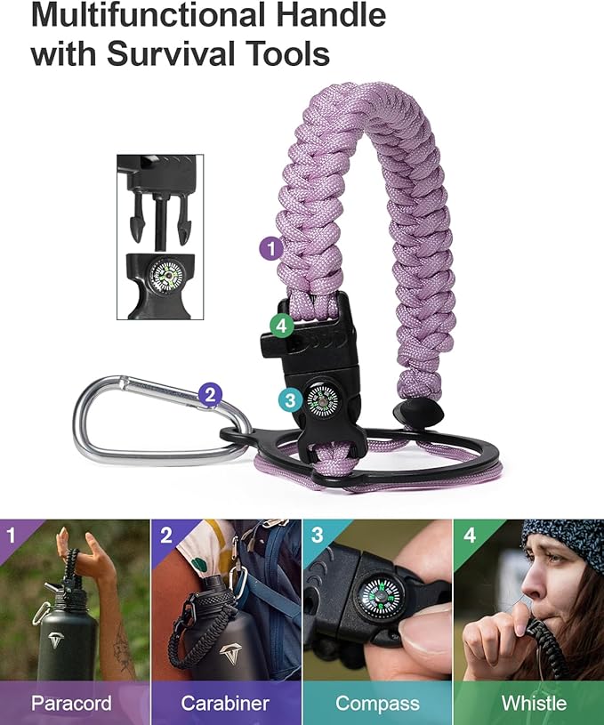 • Ready for adventures: The paracord handle is crafted from sturdy braided rope with an attached survival kit. This includes a compass, a whistle, and a clip, making it an ideal companion for any outdoor activity — be it camping,hiking or exploring new places through travelling.