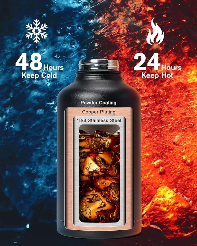 • Cold for 48H & Hot for 24H:Topre 64 oz Half Gallon Insulated Water Bottle features advanced double-wall vacuum insulation with copper plating, the water flask preserve the freshness and temperature of your drinks throughout the day.