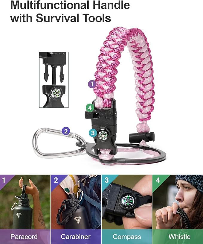 • Ready for adventures: The paracord handle is crafted from sturdy braided rope with an attached survival kit. This includes a compass, a whistle, and a clip, making it an ideal companion for any outdoor activity — be it camping,hiking or exploring new places through travelling.