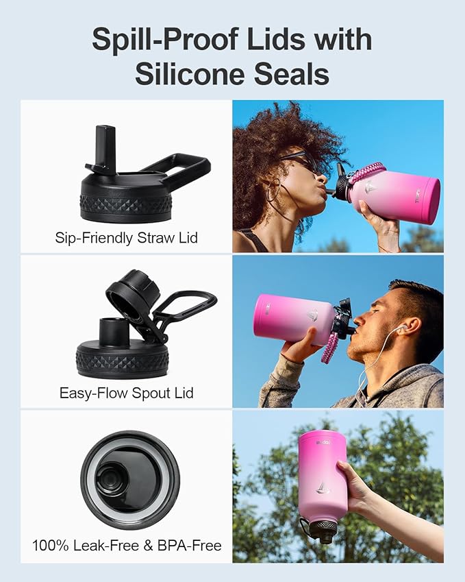 • No Leaks, No Worries: This stainless steel water bottle ncludes two leak-proof lids—a straw lid and a spout lid. Both are equipped with silicone rings to prevent any spills or leaks, and are completely BPA-free for your peace of mind.
