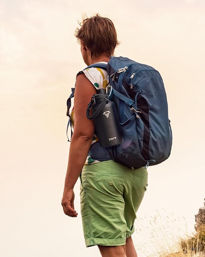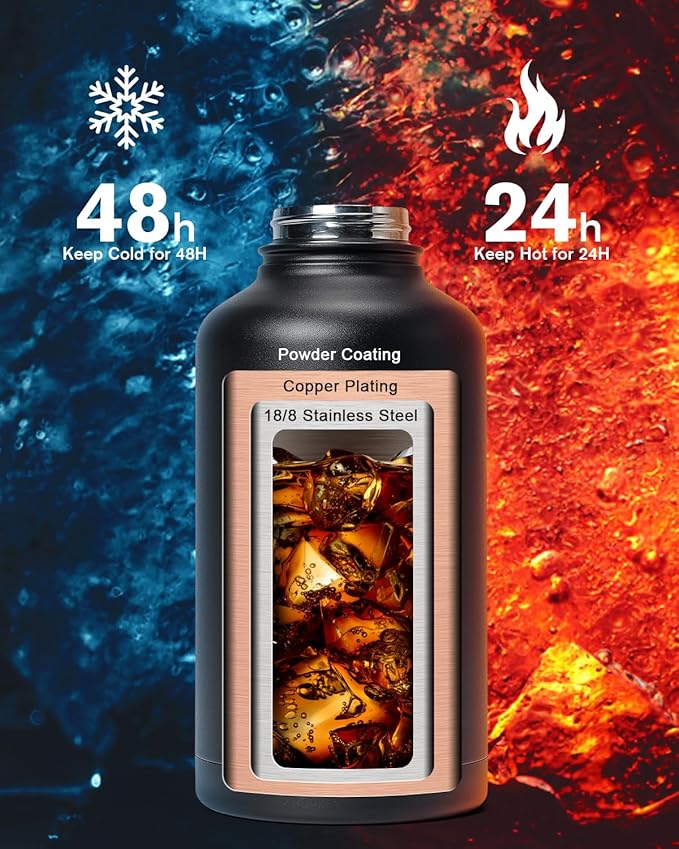 • Cold for 48H & Hot for 24H:Topre 64 oz Half Gallon Insulated Water Bottle features advanced double-wall vacuum insulation with copper plating, the water flask preserve the freshness and temperature of your drinks throughout the day.