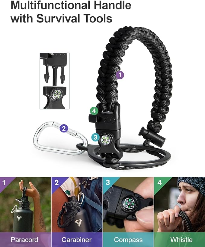 • Ready for adventures: The paracord handle is crafted from sturdy braided rope with an attached survival kit. This includes a compass, a whistle, and a clip, making it an ideal companion for any outdoor activity — be it camping,hiking or exploring new places through travelling.