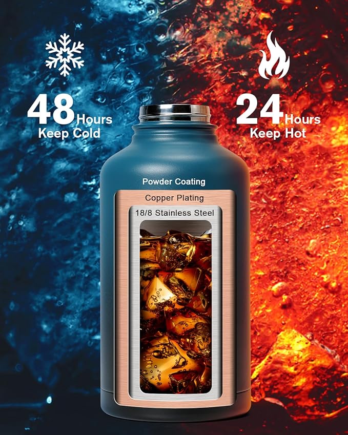 • Cold for 48H & Hot for 24H:Topre 64 oz Half Gallon Insulated Water Bottle features advanced double-wall vacuum insulation with copper plating, the water flask preserve the freshness and temperature of your drinks throughout the day.
