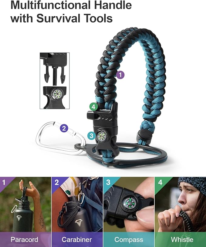 • Ready for adventures: The paracord handle is crafted from sturdy braided rope with an attached survival kit. This includes a compass, a whistle, and a clip, making it an ideal companion for any outdoor activity — be it camping,hiking or exploring new places through travelling.