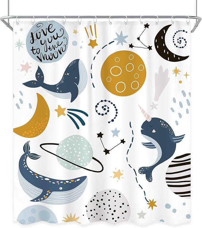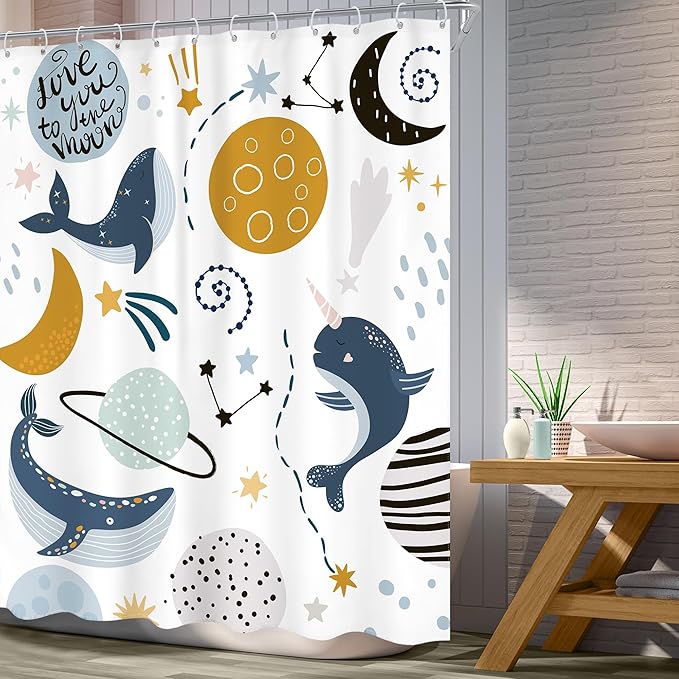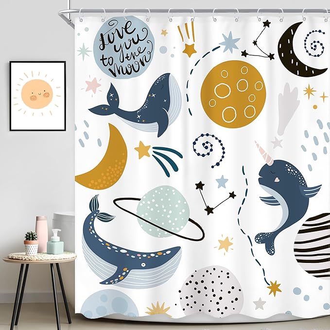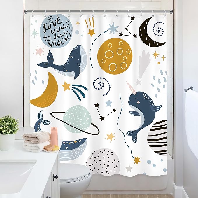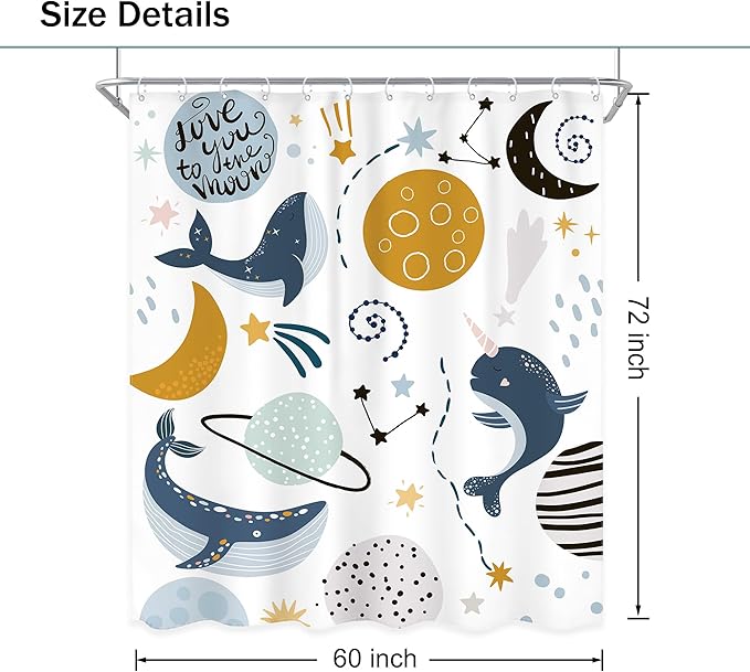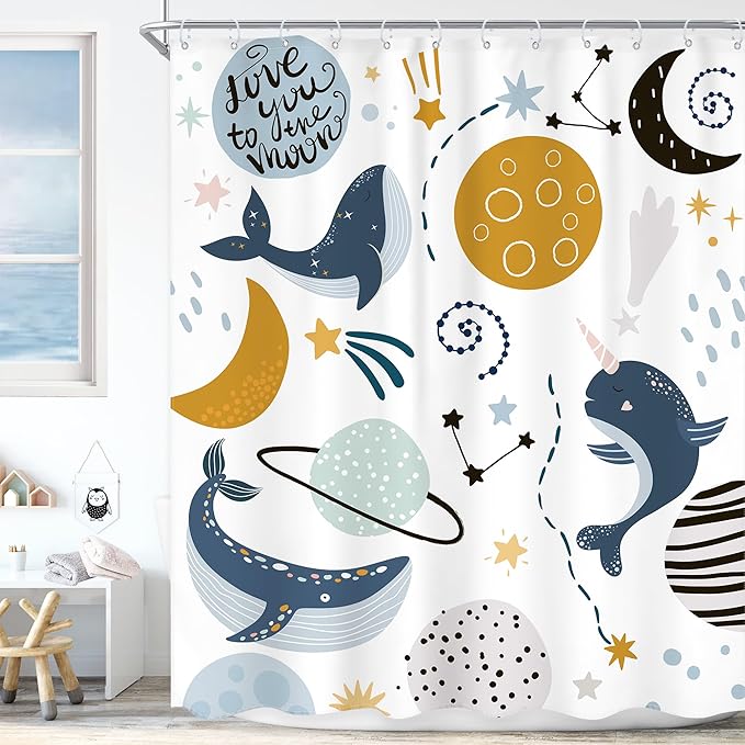 Kids Boys Whale Shower Curtain Space Ocean Cartoon Planet Cute Ocean Sea Animal Universe Galaxy Moon Stars Cool Cosmos Bathroom Set 60Wx72L Inch Bath Curtain Bathtub Accessories Home Decor