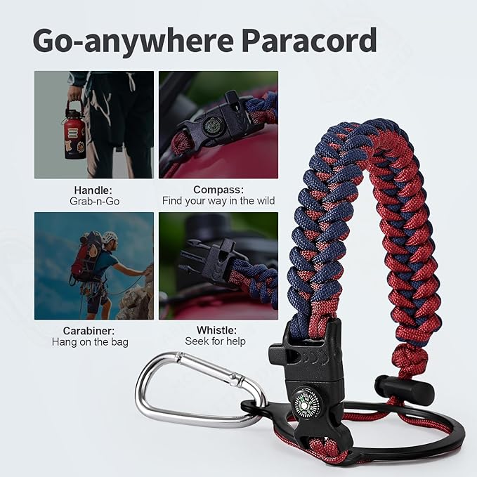 • Palm Fitting Paracord Handle: Compared to handle lids, nylon paracord on the bottle gives you more choices in terms of color coordination and coziness on your hands. Match the handle with your bottle to make a complete outdoorsy look. Compass and carabiner can be lifesavers for hiking and other expeditions