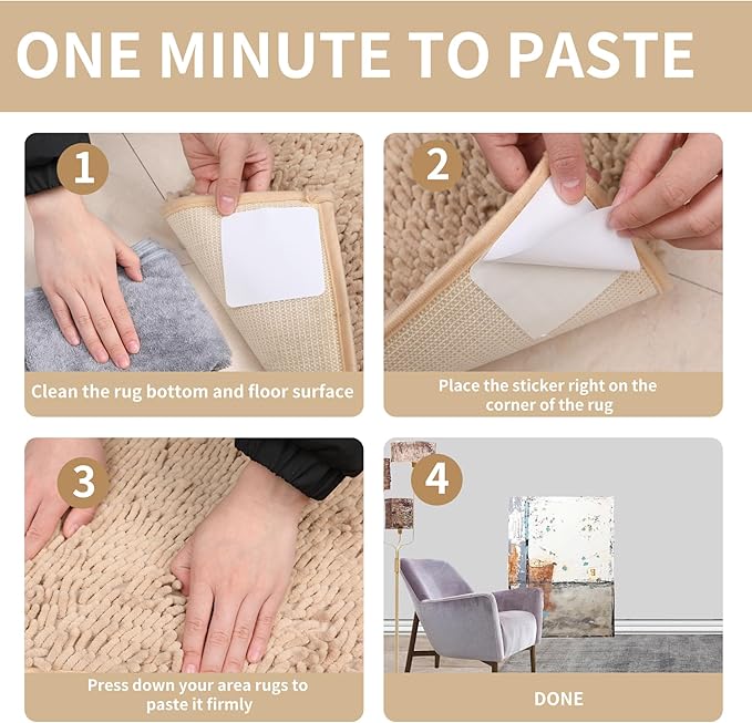 • 【QUANTITY】The kit includes 4 pieces. Each piece is square, which increases the contact area with the floor and provides better grip than the triangular shape of other rug stickers.