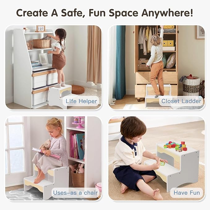 • Safety And Sturdy: This kids step stool constructs of premium MDF wood material, reinforced crossbars have been added to the front and back, making the kids stool's structure more robust and can bearing weight capacity is up to 250 lbs. It can also use as adult step stool for high closet.