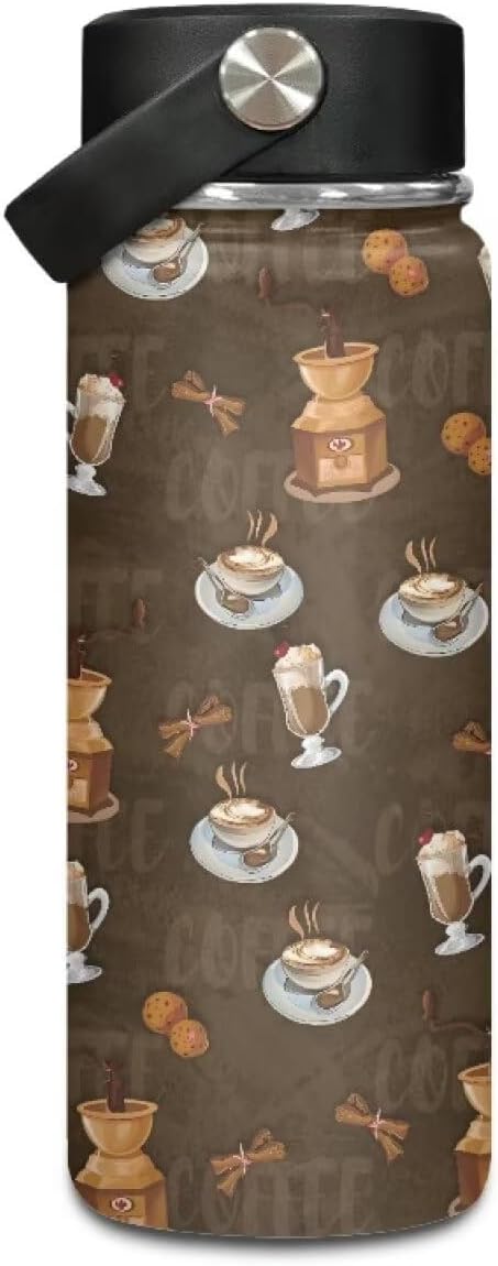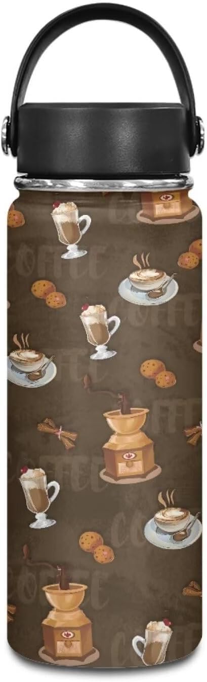 Coffee Print Insulated Water Bottle 18 Oz Stainless Steel Leak Proof Vacuum Easy to Clean Lightweight Keeps Cold and Hot Great for Travel Hiking Biking Running
