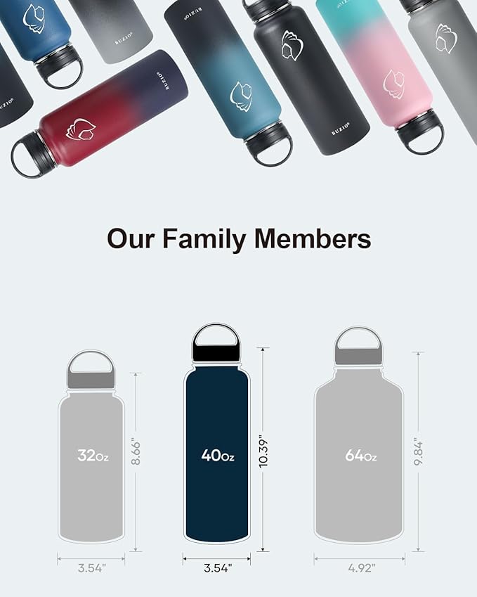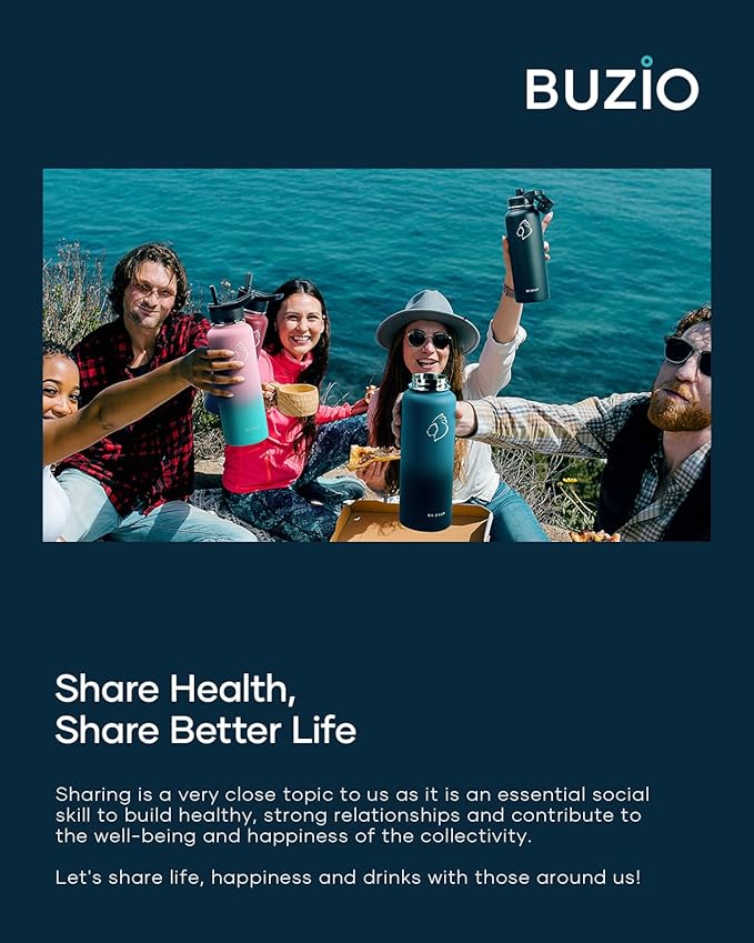 • There is Always One for you: BUZIO insulated water bottle meets your imagination in all aspects of drinking, from the comprehensive sizes (32oz-64oz) to classical and stylish designs, from the production materials to convenient accessories. Come to BUZIO, there is always one for you.