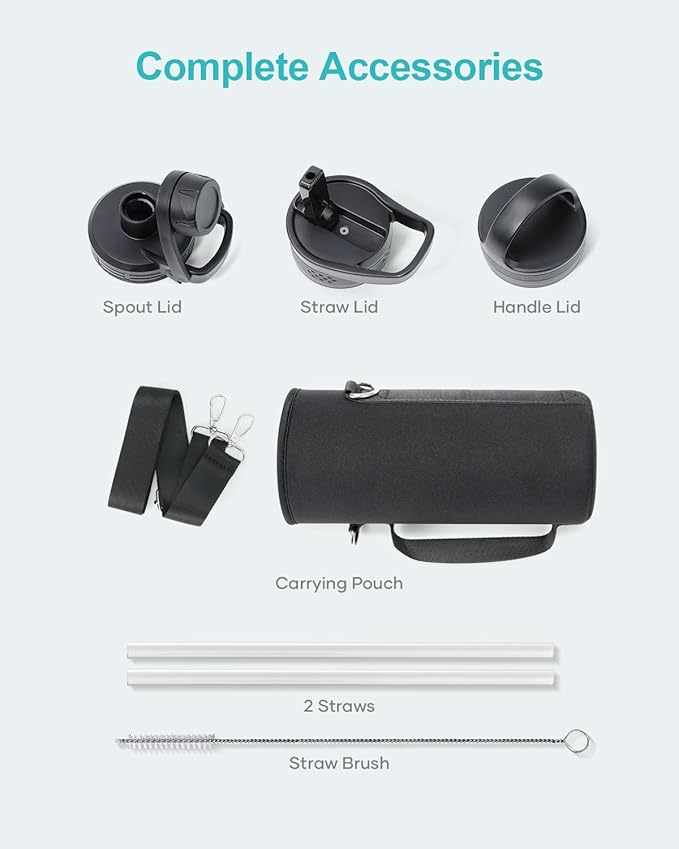 • Super Deal Combo: Buy 40oz insulated water flask, get 7 accessories. The pack includes 1 x carrying pouch, 3 x lids, 2 x straws, and 1 x straw cleaner. This bottle is ideal for camping, hiking, cycling, running, gym sessions, or outdoor work, ensuring you stay hydrated wherever you go.