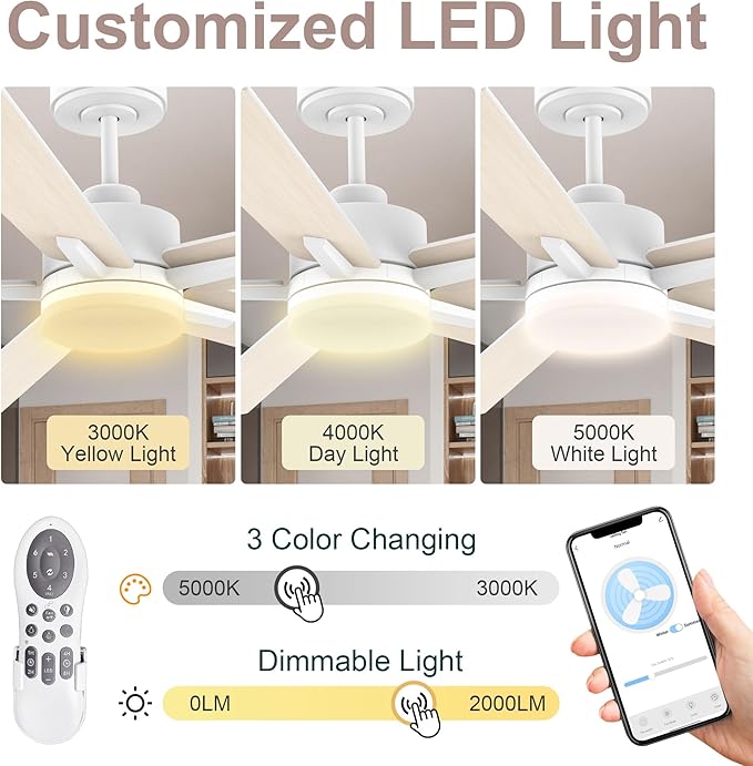 • 【Customized Color & Brightness】Lorpies ceiling fan with bright light transforms your space with 3 light modes: 3000K warm yellow light, 4000K bright daylight, and 5000K cool white light. Switch easily on the remote for relaxation,work,or entertainment. The dimmable and color-changing function can be adjusted from 0-100%, the 52 inch ceiling fan with light and remote creates perfect ideal for work,leisure,or parties. With a longer lifespan 2000 lumen fan is bright your master room enough.