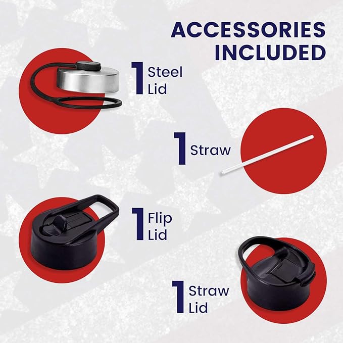 • 3 DIFFERENT LIDS PROVIDED, FOR ALL YOUR NEEDS: with our american flag stainless steel water bottles, we offer 3 different caps: a STRAW LID for easy sipping, a leak-proof METAL CAP for optimal heat retention, and a FLIP-CAP for quick, one-handed closure during activities. Each cap is designed to enhance your experience, whether you're working out, running, exploring the outdoors, or commuting. Choose the one that best suits your needs.