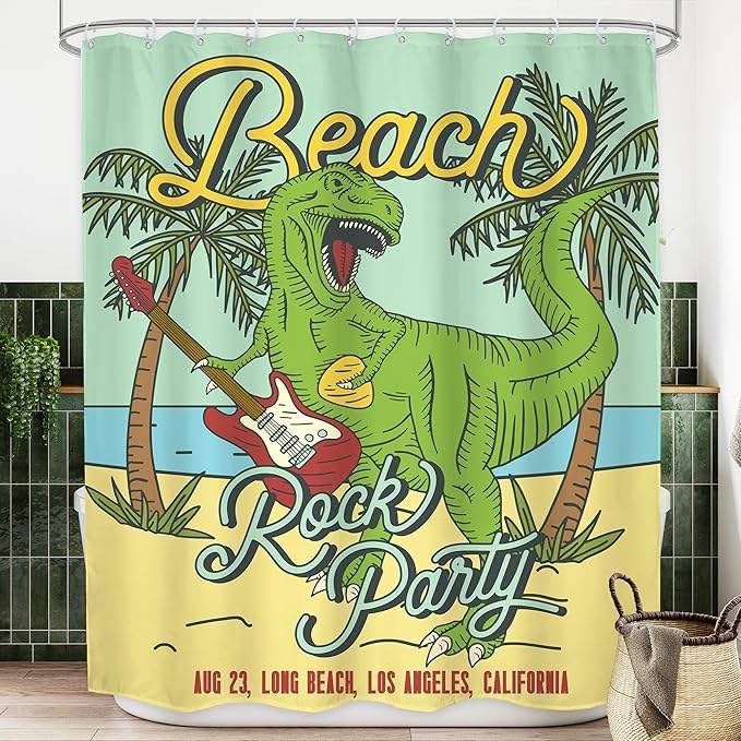LGhtyro Funny Dinosaur Kids Shower Curtain Bathroom Set 60Wx71H Inches Beach Green Cartoon Dino Trex Animal Raptor Play Guitar Bath Accessories Tropical Palm Tree Art Home Decor Fabric 12 Pack Hooks