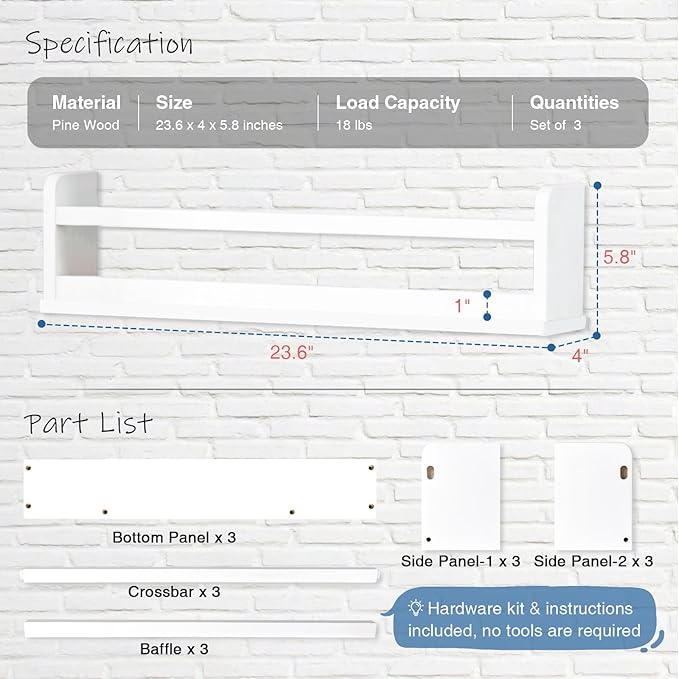 • [Sturdy and Easy Installation] These wall mount nursery bookshelf are made of premium solid wood (real pine) with advanced manufacturing processes. The package included all mounting hardware and clear installation manual. You will easy to assemble those toddler bookshelf.