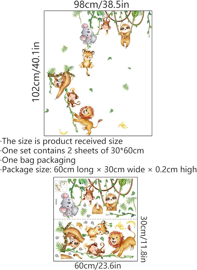 • 【Stylish Pattern】Jungle animals wall decals, lion monkey sloth koala tiger print art and modern design into an eye-catching mural. This sticker is very suitable for nursery, bedroom, playroom, living room, adorable kids room decor.