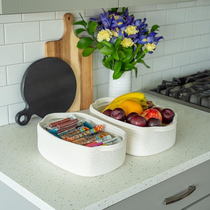 • Premium Woven Cotton Rope Baskets: These beautiful small rope baskets for bathroom provide just the right depth for displaying home decor in a kitchen, storing hand towels in the bathroom, as a baby basket organizer for nursery decor, or as a front entry catch-all.