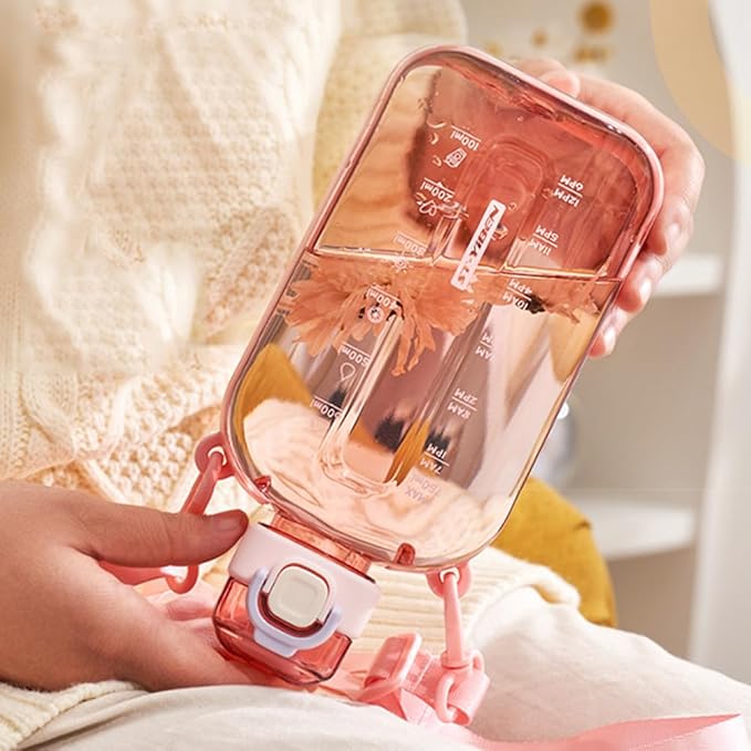 750ML Square Transparent Water Bottle, Cute Sports Water Jug with Adjustable Strap, Portable Motivational Water Bolttles for Travel, Hiking and Outdoor Workouts