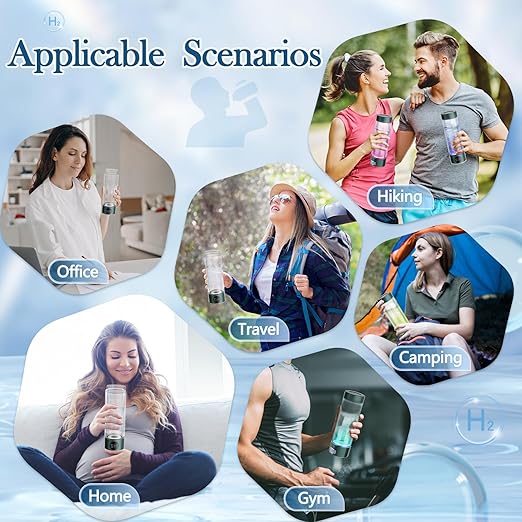 • 【Easy to Use and Clean】The hydrogen water bottle makes it effortless to enjoy hydrogen-rich water. Simply pour 80% of water into the bottle, Just press lightly, the blue light on the bottom lights up and the hydrogen gas decomposes from the water. Equipped with a unique design, both the bottom and top can be easily unscrewed for easy cleaning, hydrogen water maker provide you with the best hydrogen-rich water experience.