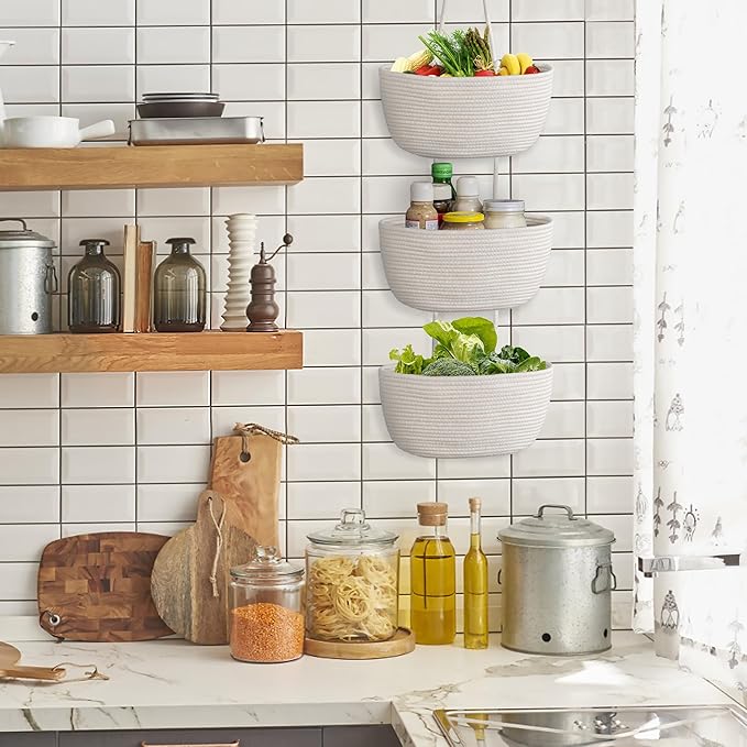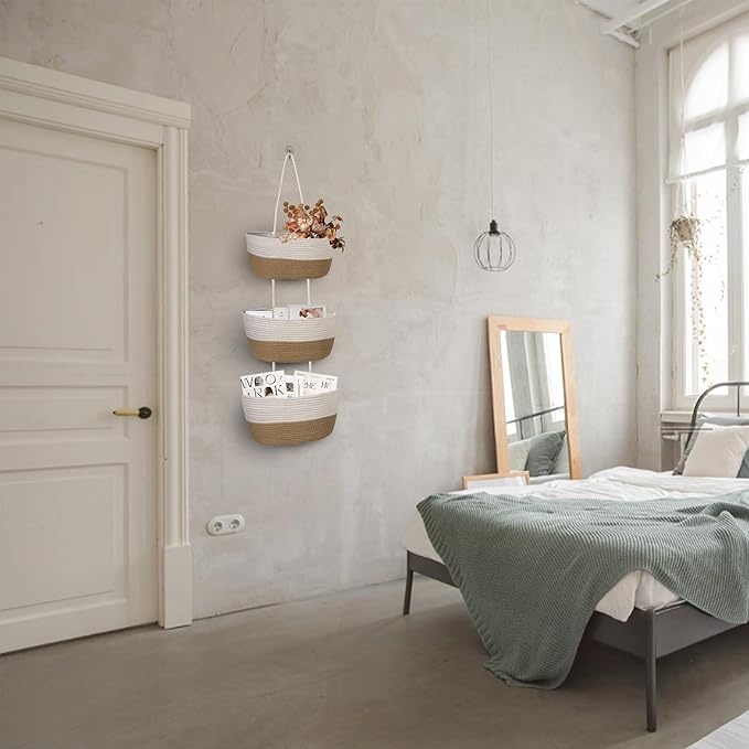• STRONG AND DURABLE: Hanging rope baskets are made of soft but sturdy woven cotton cord, made by experienced craftsmen who take great care in sewing and detailing, so the hanging 3-tier storage baskets have a strong load-bearing capacity