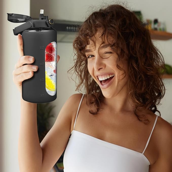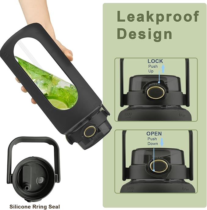 • 【A Motivational Water Bottle 】 Our half gallon glass water bottle with straw can hold 64oz of water, which is equivalent to the 8 cups of water recommended by scientists for humans to drink every day, helping you maintain moisture and drink enough water throughout the day.