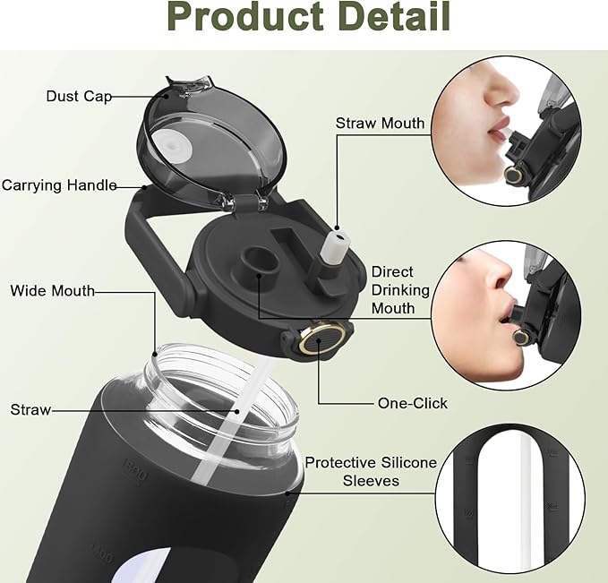 • 【High-Quality Borosilicate Glass Bottle】 This large motivational water bottle is made of borosilicate glass withstand extremely cold or hot temperatures. Straw and lid are made of food-grade PP. 100% leak-proof, Reusable, BPA-Free , Cadmium-Free and has No chemical smell bottle.