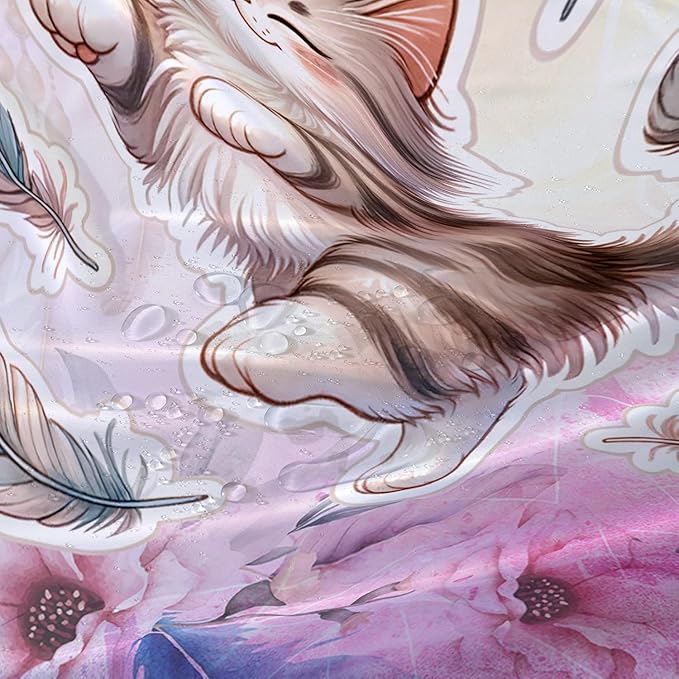 AILONEN Cartoon Cat Shower Curtain,Kawaii Dance Kitten and Feathers Bathroom Curtain Set for Kids Boys,Cute Animal Kittens Waterproof Shower Curtain for Bathroom, 72" W*96" H Pink
