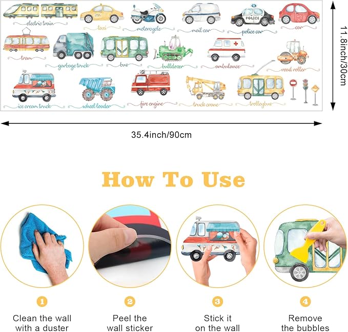 • [Easy to Peel and Stick Kids] This set of transports wall decals peel and stick is suitable for all smooth surfaces, including walls, furniture, windows, doors, mirrors, or anywhere you can imagine that can be decorated.