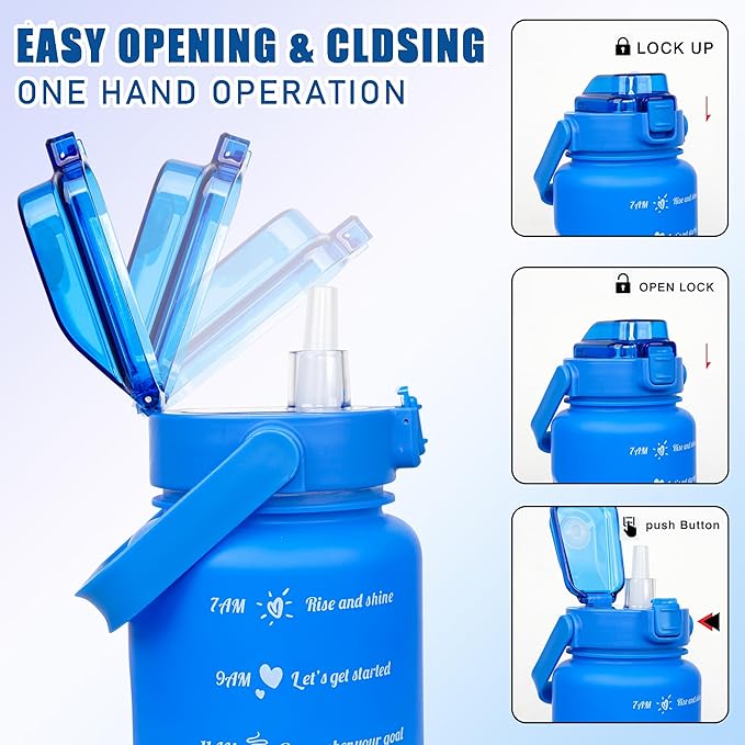 • [Leak-proof & easy to drink]: Half gallon water jug for drinking has a food-grade silicone seal, a safety lock and a dust proof cap. Just press the lock button, the lid pops open and the straw automatically rises. The workout water bottle gallon cap combines leak-proof, convenience and hygiene in one. The water gallon jug also has a removable straw for easy cleaning. Remove the straw to become a spout cap, making this black water bottle ideal for sharing drinks.