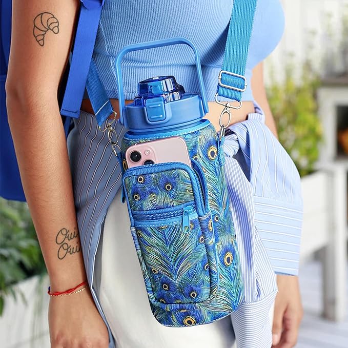 Peacock Half Gallon Water Bottle with Sleeve Water Bottle 64 Oz Water Bottle with Time Marker, Leakproof-Free Drinking Water Bottle, Sports Water Bottle Peacock Feather Half Gallon Water Jugs