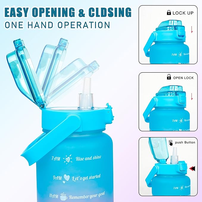 • [Leak-proof & easy to drink]: Half gallon water jug for drinking has a food-grade silicone seal, a safety lock and a dust proof cap. Just press the lock button, the lid pops open and the straw automatically rises. The workout water bottle gallon cap combines leak-proof, convenience and hygiene in one. The water gallon jug also has a removable straw for easy cleaning. Remove the straw to become a spout cap, making this black water bottle ideal for sharing drinks.