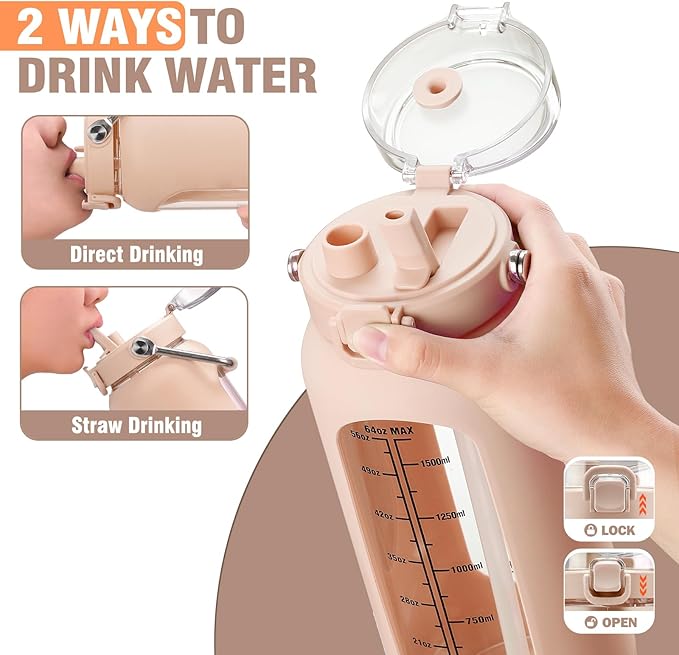 • Glass Water Bottle with Straw Lid: Our 64 oz glass water bottle, furnished with a convenient straw lid, showcases an innovative and fail-safe design. Its pioneering one-click button system simplifies the drinking process—just a gentle press and the lid opens automatically, ensuring a hassle-free experience.