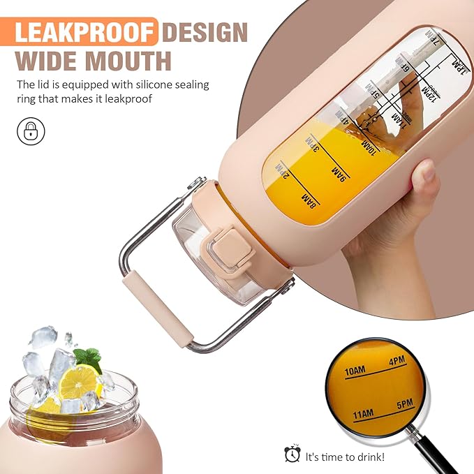• Glass Bottle with Time Marker: Our half-gallon water bottle comes equipped with practical time and water capacity guides, making it effortless to track your daily hydration targets. With an ample 64 oz capacity, meeting the recommended daily intake of 8 cups, this motivating water vessel streamlines the inconvenience of frequent refills.