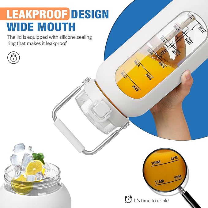 kytffu 64 oz Glass Water Bottle with Straw and Stainless Steel Handle, Half Gallon Water Bottle with Silicone Sleeve and Time Marker, 2L Large Glass Bottle for Gym, School, Travel, Leak-proof (White)