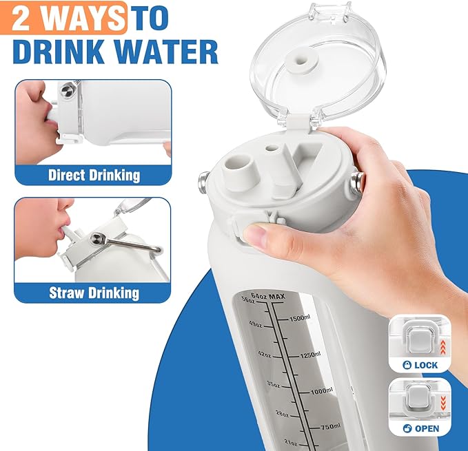 • Glass Water Bottle with Straw Lid: Our 64 oz glass water bottle, furnished with a convenient straw lid, showcases an innovative and fail-safe design. Its pioneering one-click button system simplifies the drinking process—just a gentle press and the lid opens automatically, ensuring a hassle-free experience.