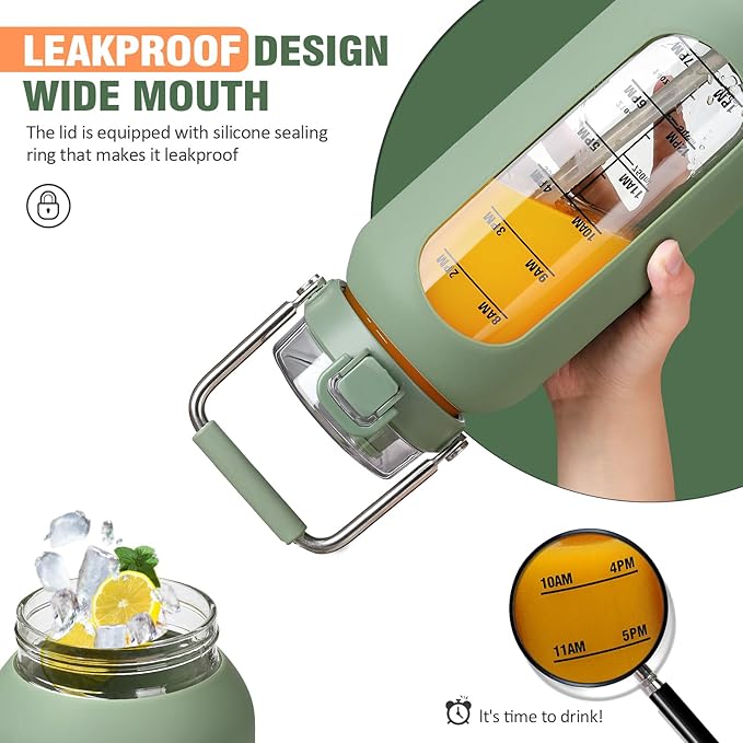kytffu 64 oz Glass Water Bottle with Straw and Stainless Steel Handle, Half Gallon Water Bottle with Silicone Sleeve and Time Marker, 2L Large Glass Bottle for Gym, School, Travel, Leak-proof (olive)