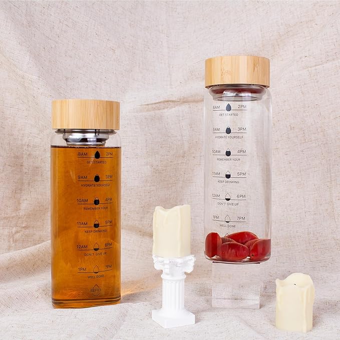 • Stay Hydrated: Our 25oz borosilicate glass water bottle reminds you to stay hydrated throughout the day. Crafted from high-quality materials, it delivers a pure taste, keeping you refreshed and energized!