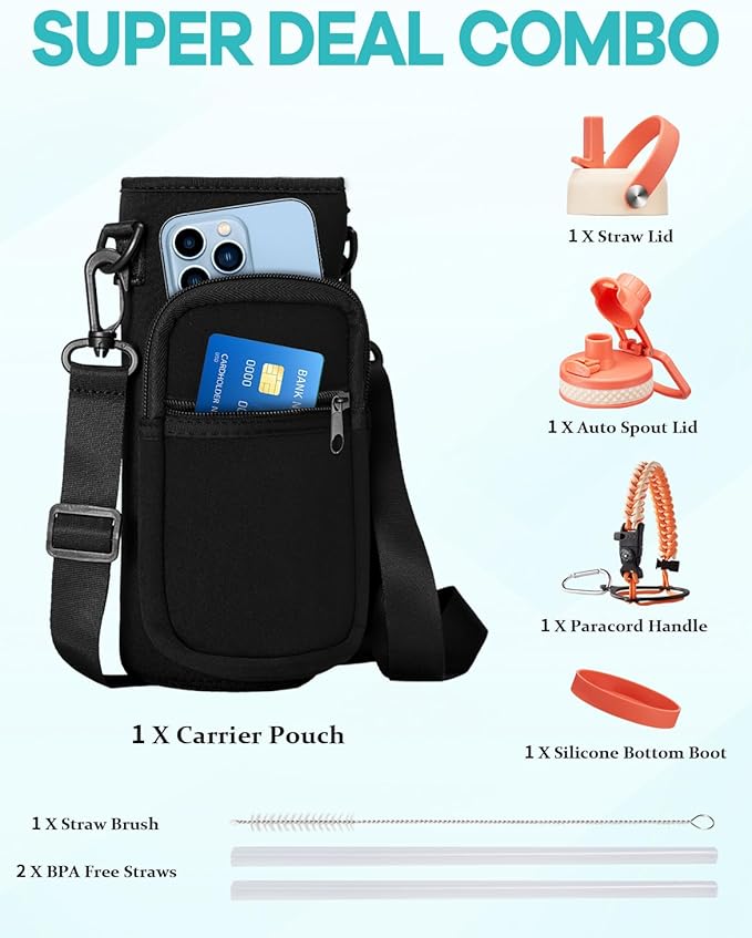 • SUPER DEAL COMBO - Buy one 32 oz insulated water bottles, get 9 accessories: 1 x straw lid, 1x Auto Chug lid, 1 x paracord handle, 2 x straws(BPA Free), 1 x carrier bag, 1 x shoulder strap, 1 x protective silicone boot, 1 x straw brush. The 32oz insulated water flask perfect to keep you stay hydrated throughout the day