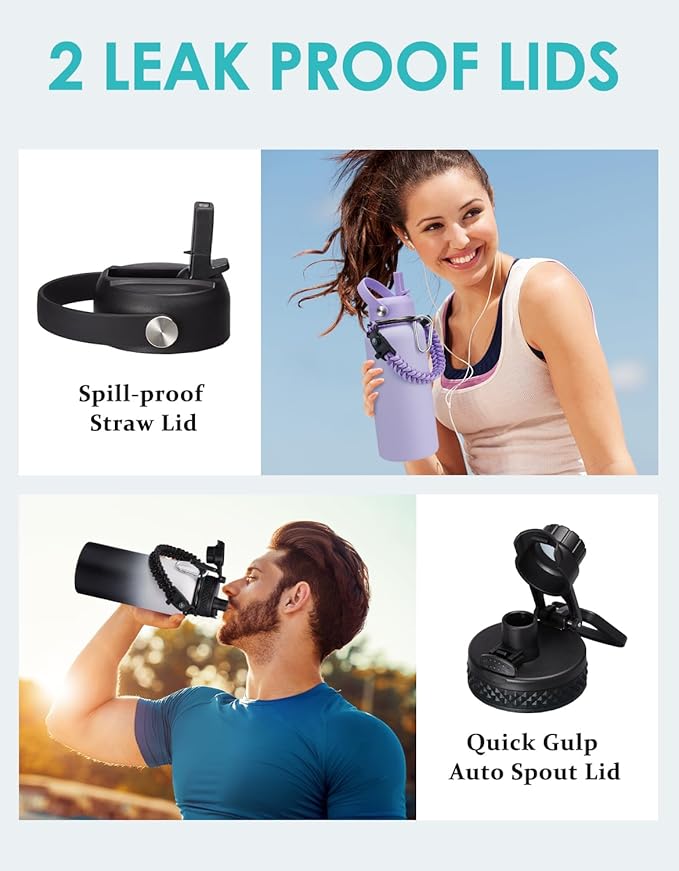 • LEAK-PROOF 2 LIDS - AUTO SPOUT LID & STRAW LID allow you enjoy spill-proof sipping and fast drinking to meet your different drinking needs. The pop-up spout lid is designed for one-hand open and close, with a large water outlet for fast drinking. The spill-proof straw lid makes you easy sip on the go, great to all your outdoor adventures, and also prevent the inhalation of ice cubes
