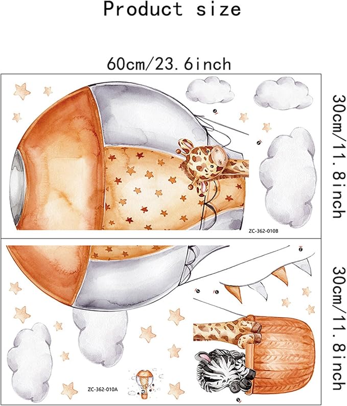 • 1. Vibrant Safari Animal Wall Decals: Transform your space with our high-quality vinyl wall stickers featuring adorable hot air balloons, zebras, giraffes, and stars. Waterproof and removable, they are perfect for nursery, kid's room, school classroom, living room, bedroom, or bathroom decor.