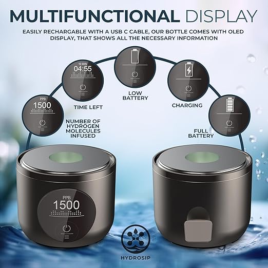 • Smart Design with OLED Display: This water hydrogenator bottle is not only performant and portable but also smart and user-friendly. The OLED display allows easy access to the bottle settings while the single button ensures effortless hydrogen infusion with just a touch.