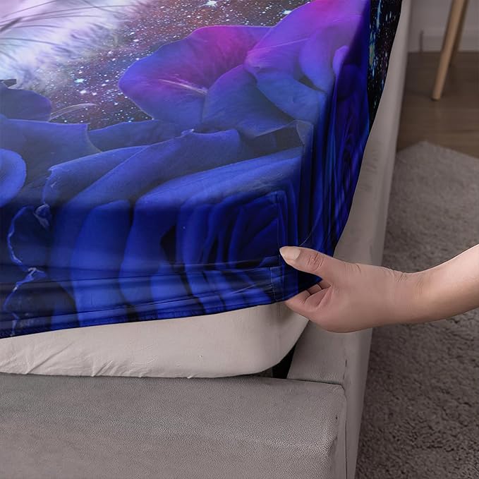 AILONEN Wolf Print Fitted Sheet Set Full Size, Moon Galaxy Wolf Bed Sheet Set Full,3 Pieces Full Romantic Blue Rose Wolf Fitted Sheet with 2 Pillowcases