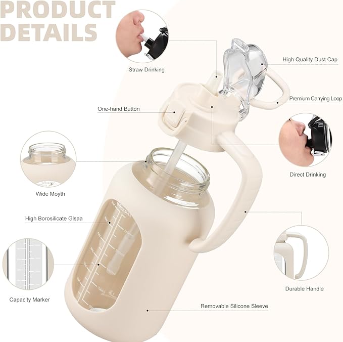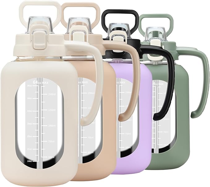 • 【Glass Water Bottle with Silicone Sleeve】Olivego big water bottle for easy to carry and use. The half gallon water bottle with straw has an anti-slip and high quality silicone sleeve to protect the glass water bottle and help prevent it from being slippery in your hands or slight bumps.The handle ensures a firm grip & our wide mouth flip cap spout makes pouring easy & smooth.